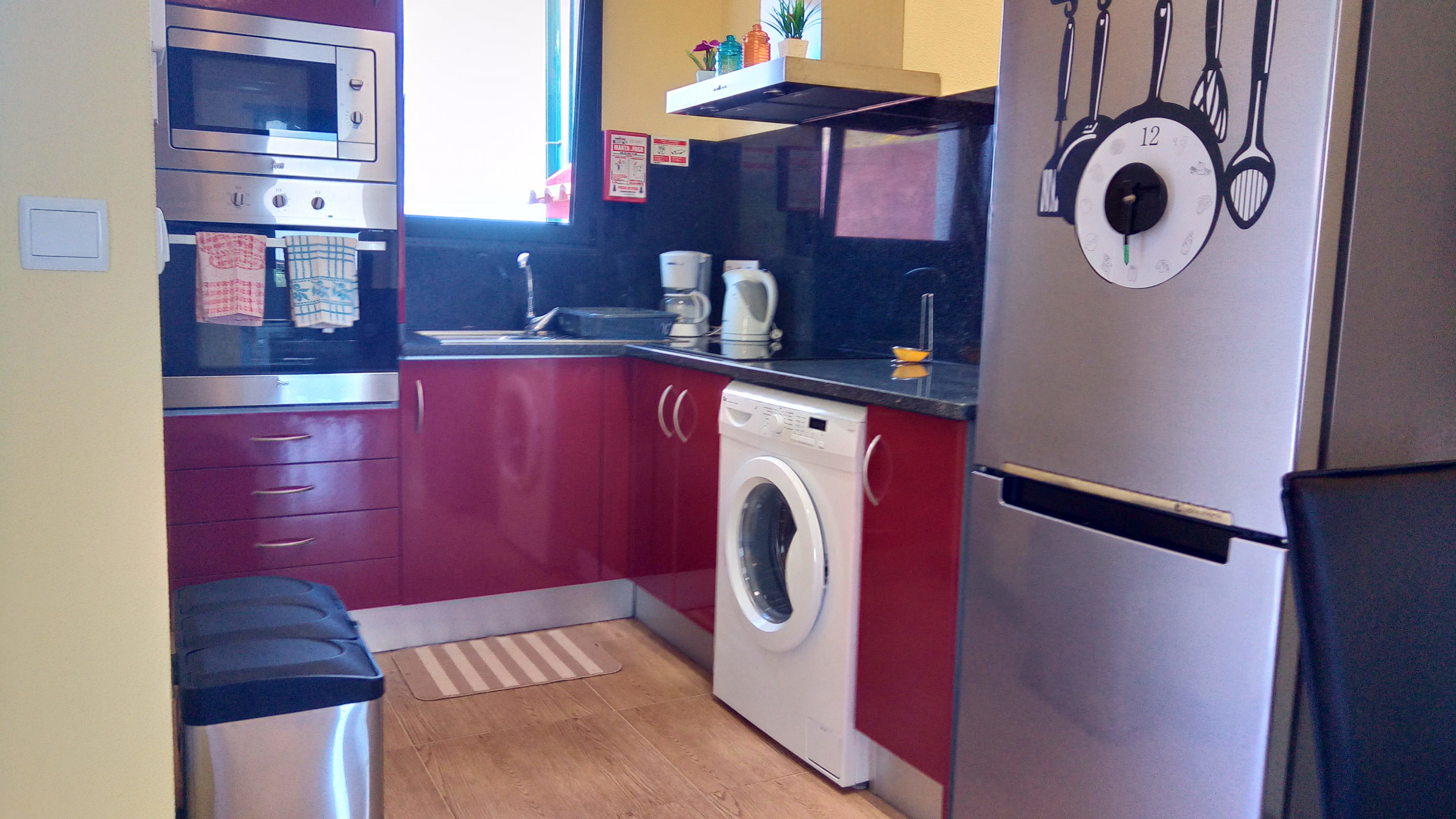 La cuisine, est équipée avec réfrigérateur, four, lave-linge et bouilloire.
