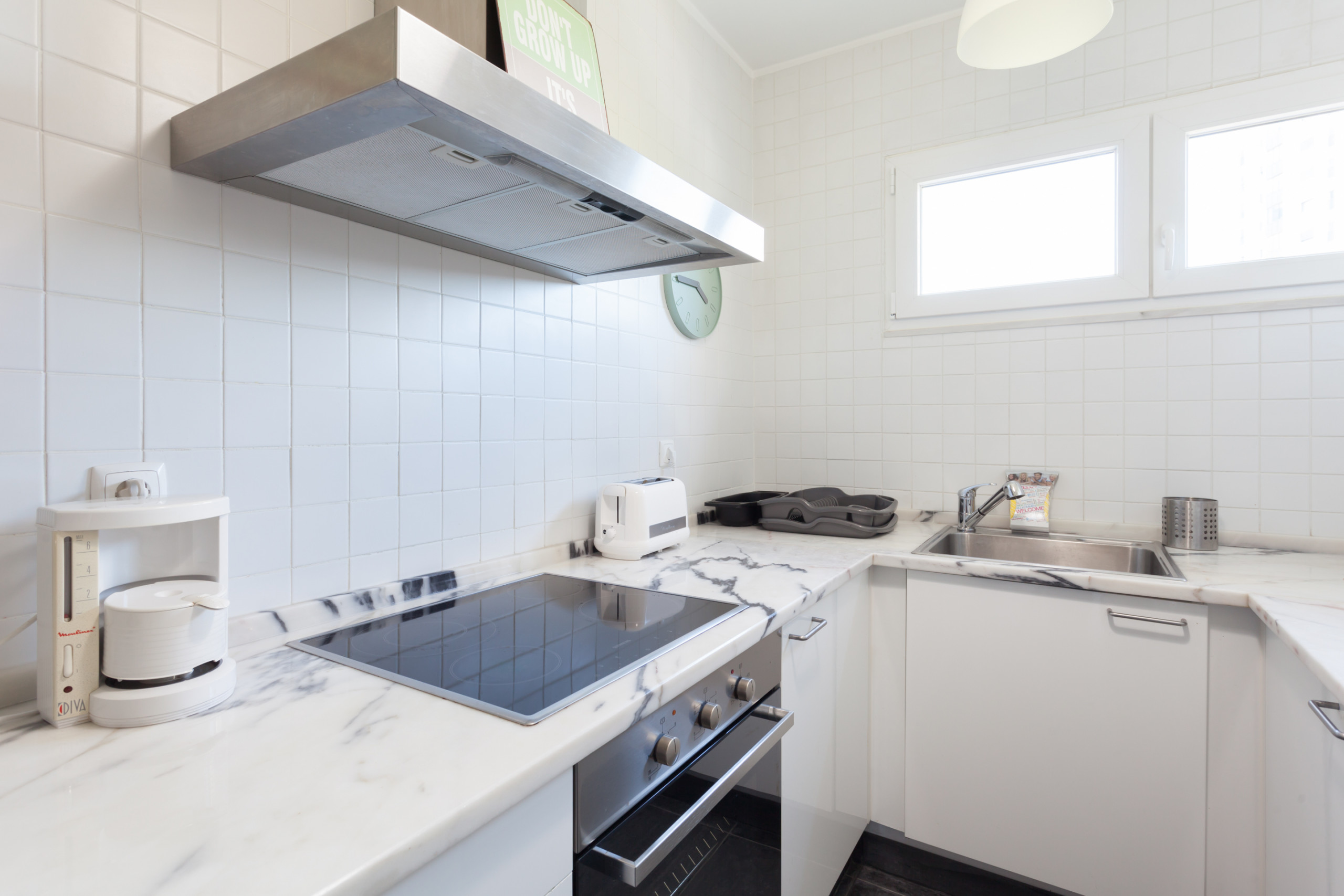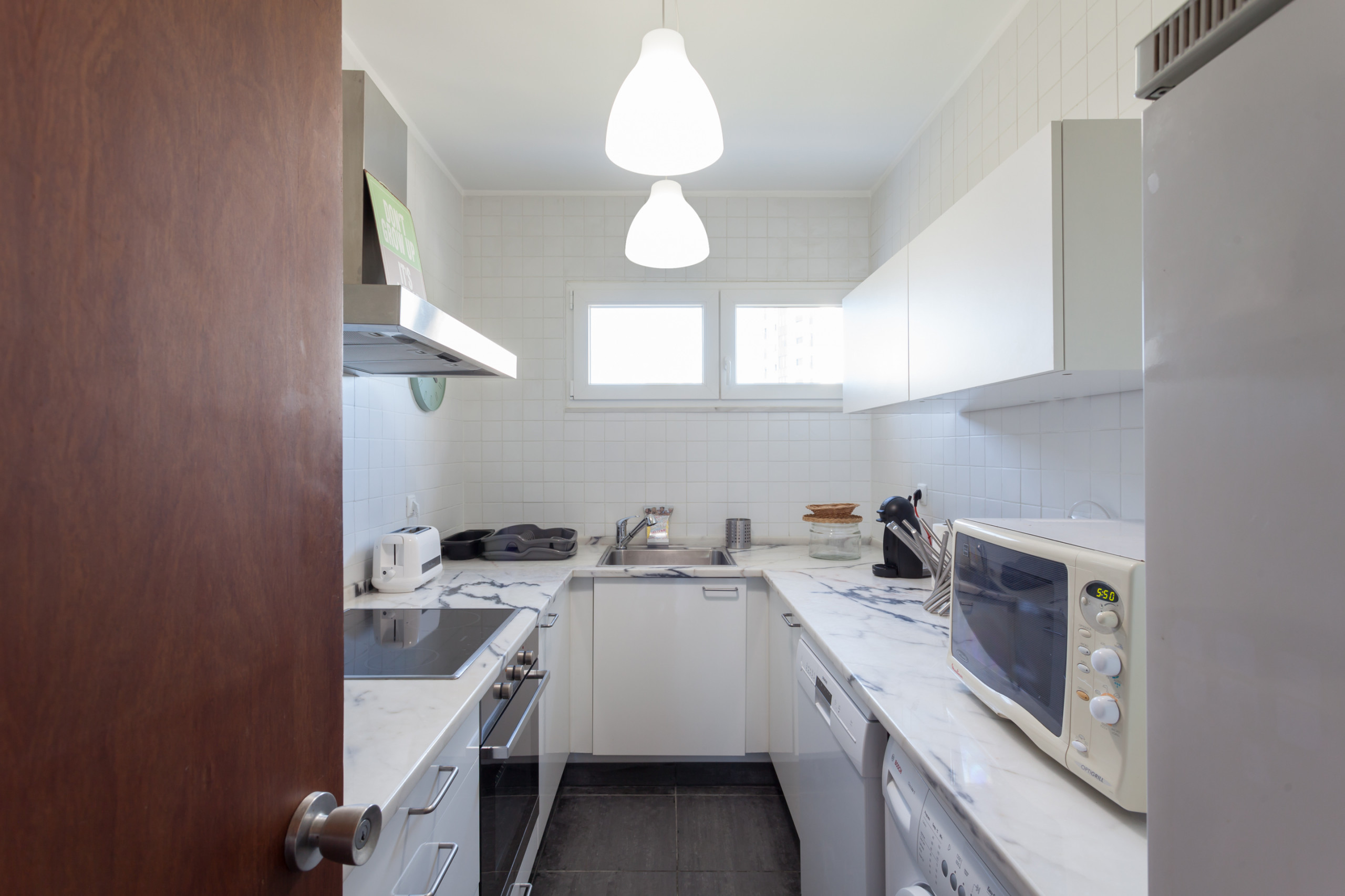Everything. The description matches the object. The apartment was even larger than I expected from the photo. The kitchen is fully "charged" (large fridge, stove, oven, microwave, capsule coffee machine, kettle, dishwasher, washing machine). You can ver mais