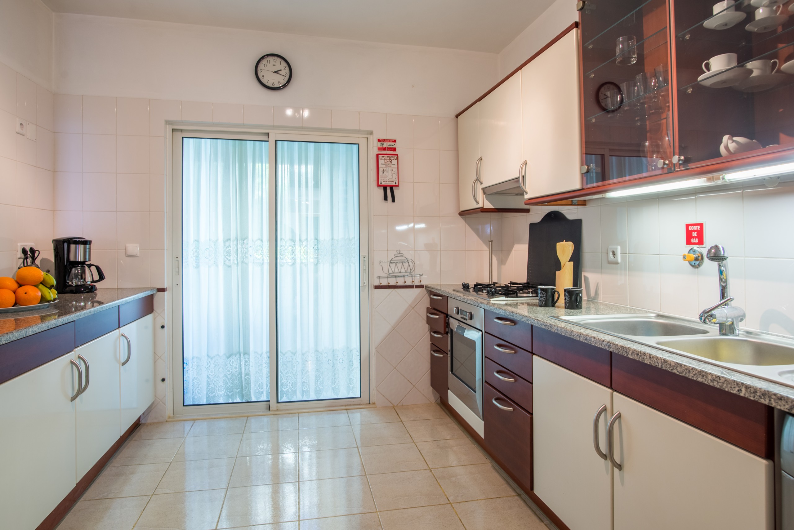 A cozinha, está equipada com frigorífico, microondas, forno, máquina de lavar roupa, máquina de secar roupa, máquina de lavar louça, louça/talheres, utensílios/cozinha, cafeteira, torradeira e jarro eléctrico.