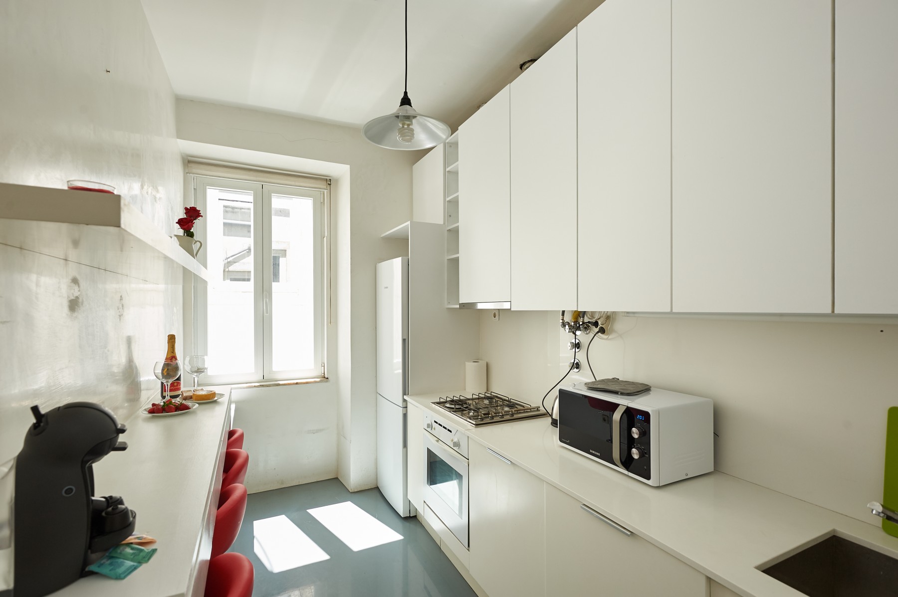 - cozinha: bancadas, espaco de arrumacao, bancos e maquina de lavar loica
